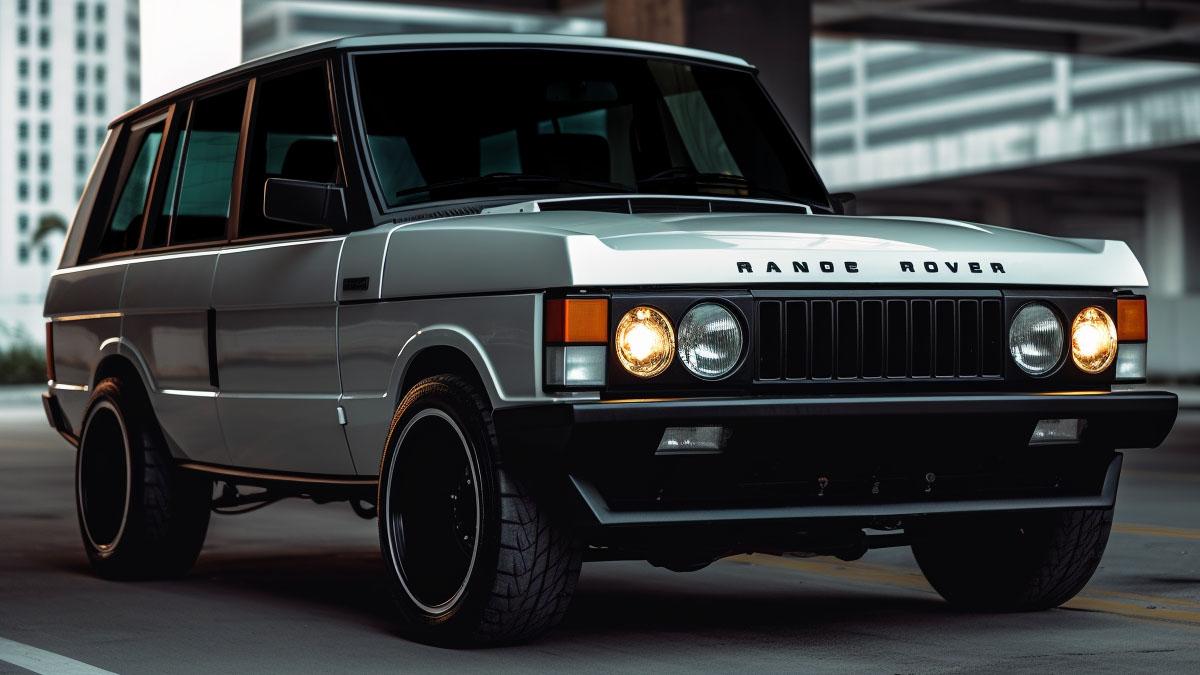 Another one that looks real. The Range Rover Sport appeared in 2005 as a mid-sized luxury SUV. The first Range Rover appeared in 1969, and was two-door only until ’81, so an imagineered ’74 RRS has ended up looking largely like a smaller Range Rover Classic with fat wheels and no rear doorhandles.